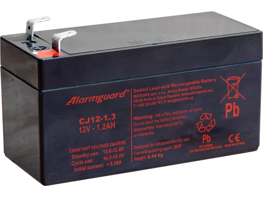 CJ12-1.3 12V 1.3Ah - záložní , bezúdržbový, VRLA, uzavřený, akumulátor značky ALARMGUARD. Technologie AGM. Určený převážně pro EZS, EPS. Výhradní dovozce firma MICRONIX, spol. s r.o.