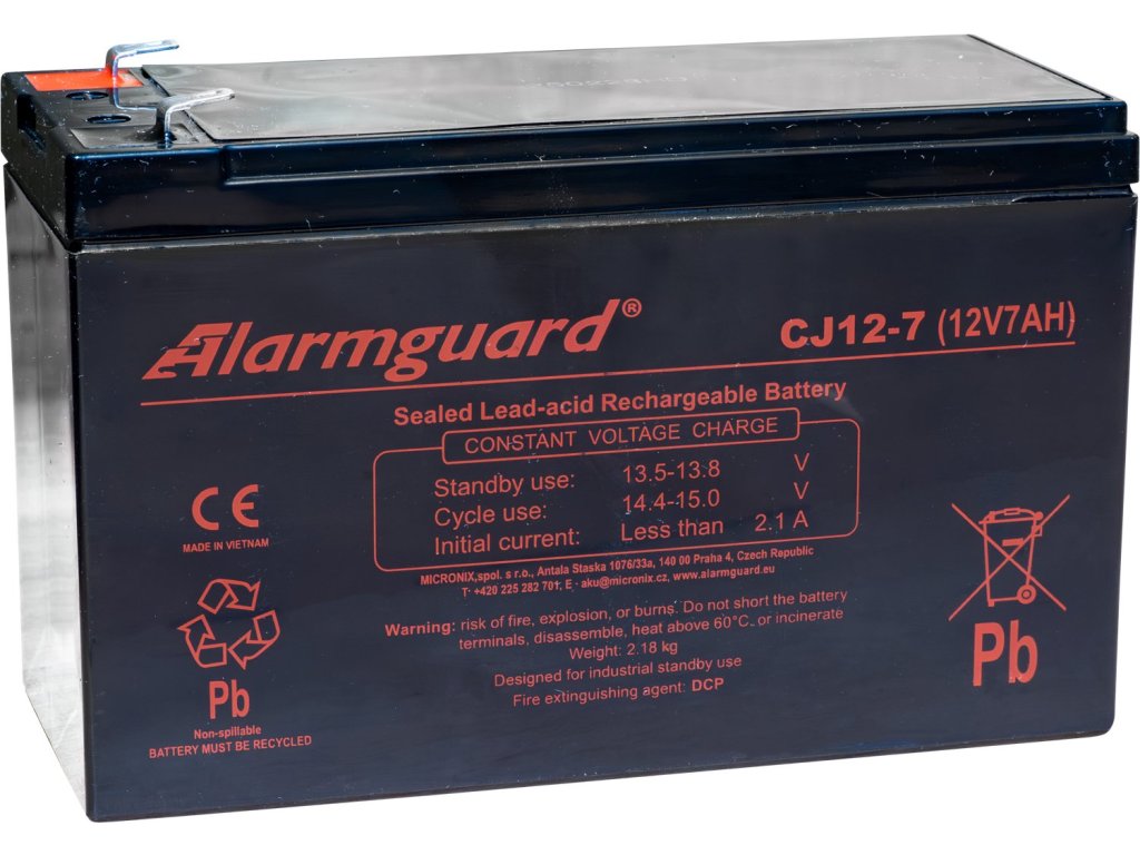 CJ12-7 12V 7Ah - záložní , bezúdržbový, VRLA, uzavřený, akumulátor značky ALARMGUARD. Technologie AGM. Určený převážně pro EZS, EPS. Výhradní dovozce firma MICRONIX, spol. s r.o.