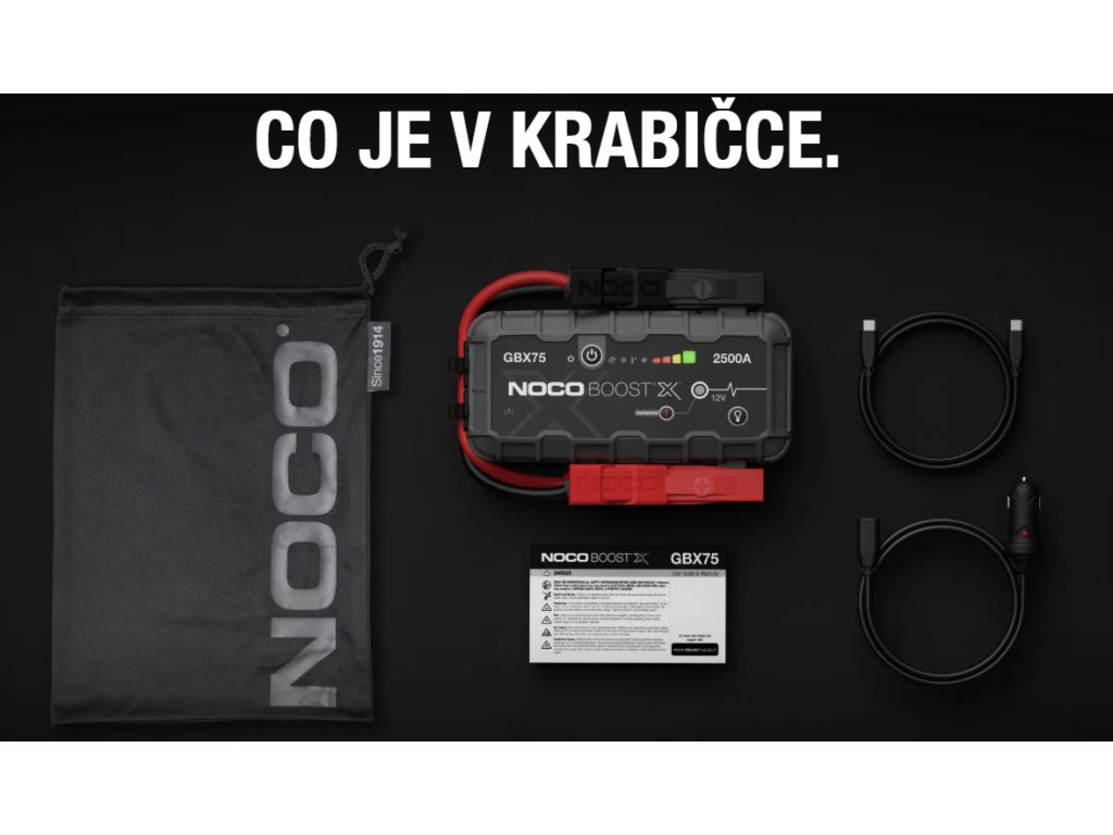 NOCO GBX75 12V 2500A přenosné startovací zařízení. GBX75 slouží pro nouzové startování osobních automobilů i s naftovým motorem, kamionů, dodávek, lodí, motocyklů, čtyřkolek, sekaček atd. proudem až 2500A. Výrobce NOCO. Dovozce MICRONIX,spol. s r.o.