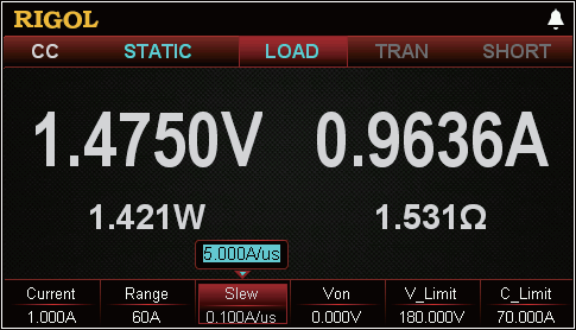 DL3041 podporuje nastavitelnou rychlost změny proudu v rozsahu 0.001 až 5 A/µs. To umožňuje simulovat velmi rychlé změny zátěže a realisticky ověřovat chování bateriových systémů a výkonových měničů.