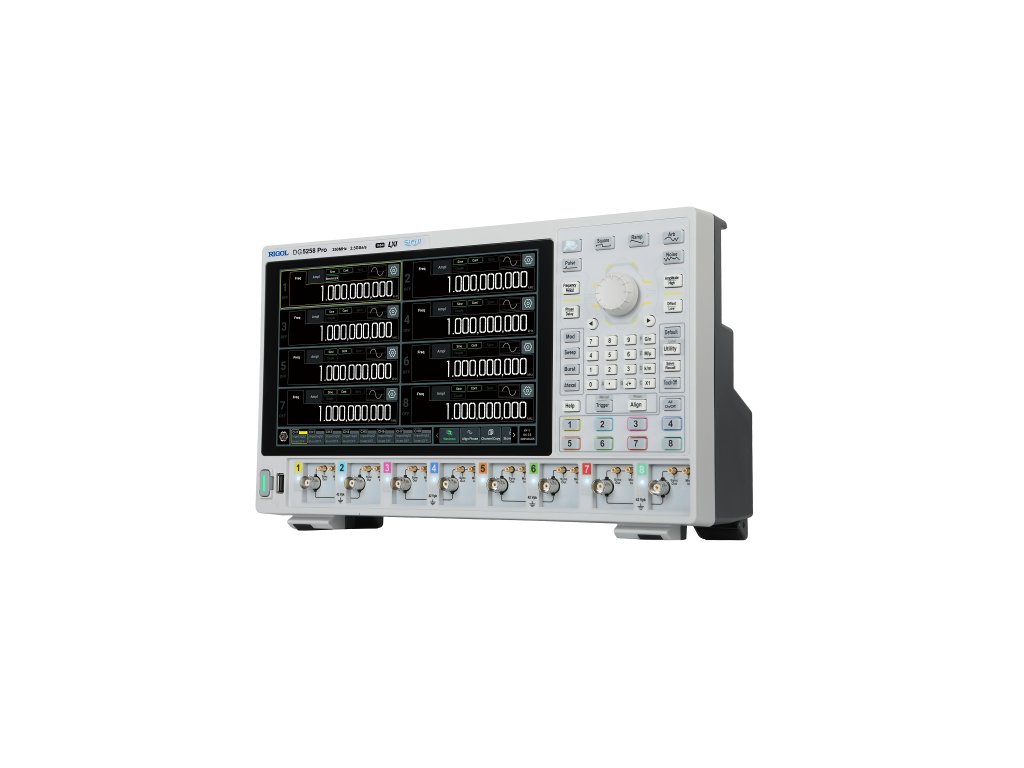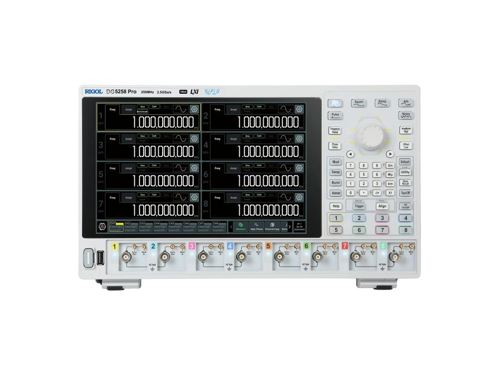 RIGOL DG5258 Pro je profesionální arbitrární generátor signálů s osmi plně nezávislými výstupními kanály, navržený pro komplexní laboratorní a vývojové aplikace, kde je nutná souběžná práce s více signály. Kombinace maximální výstupní frekvence 250 MHz, vzorkovací frekvence 2.5 GSa/s a 16bitového vertikálního rozlišení zajišťuje vysokou přesnost i při paralelním generování náročných signálových scénářů.