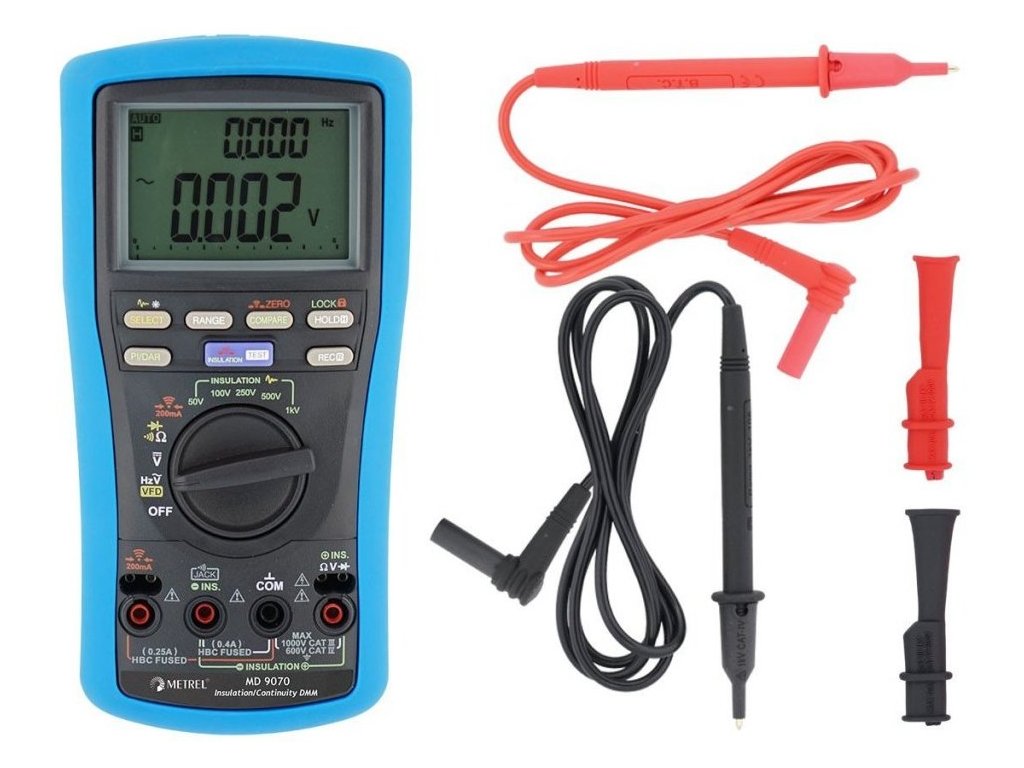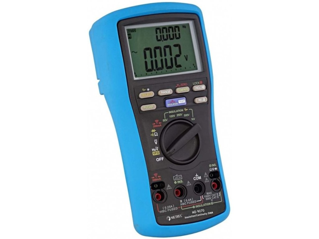 MD 9070 je vysoce přesný TRMS multimetr pro měření izolačního odporu a spojitosti, který lze používat v prostředí CAT IV / 600 V. Dvojitý digitální displej poskytuje obsluze všechny potřebné údaje a jeho velikost zaručuje, že jej lze ovládat jednou rukou. Přístroj je vybaven vestavěnou funkcí VFD, díky níž je schopen měřit skutečné efektivní hodnoty v souladu s frekvencí, provádět měření PI/DAR a test diod. Přístroj MD 9070 má širokou škálu dalších funkcí, včetně funkce podržení dat, paměti, min/max, rozdílu, automatického vypnutí, automatického nastavení rozsahu, frekvenčního filtru, uzamčení, resetu, relativního měření a dalších.