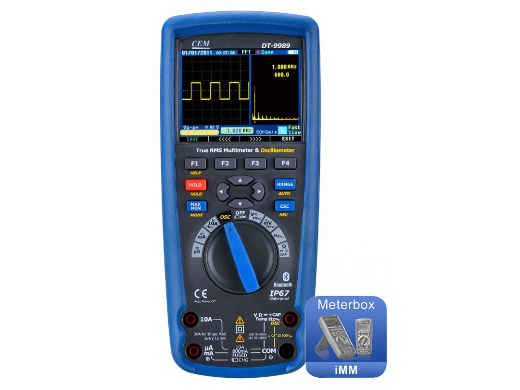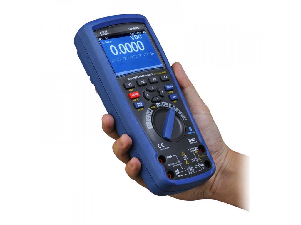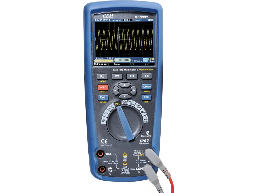 CEM DT-9989 je průmyslový True RMS multimetr s osciloskopickými funkcemi a 3.5” TFT barevným LCD displejem.