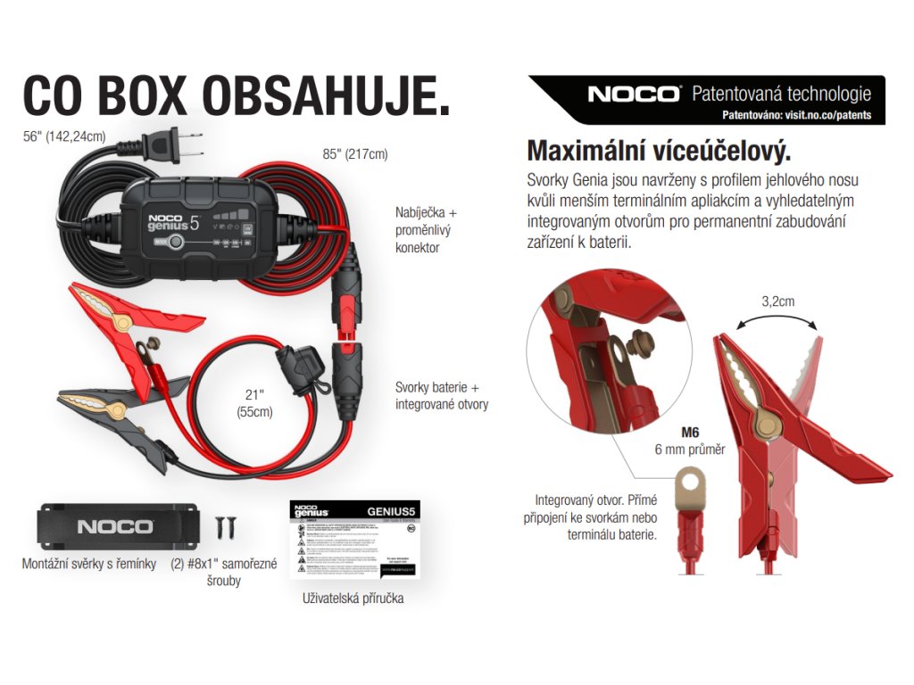 Noco Genius5 6V/12V-5A automatická nabíječka. Výrobce NOCO. Dovozce firma MICRONIX, spol. s r.o. Nabíječka slouží pro nabíjení olověných kyselinových, bezúdržbových, Super MF, GEL, VRLA, AGM, záložních a Lithium-ion akumulátorů o kapacitě do 120Ah a pro režim udržování akumulátorů všech velikostí.