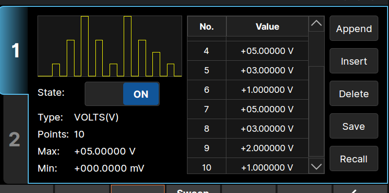 Režim List umožňuje vytvořit vlastní měřicí sekvence s minimálním intervalem 10 µs. Můžeš si nastavit lineární i zcela vlastní průběhy a zároveň během testu měřit a ukládat data. Ideální pro vícefázové testy nebo dlouhodobé zatěžování součástek.