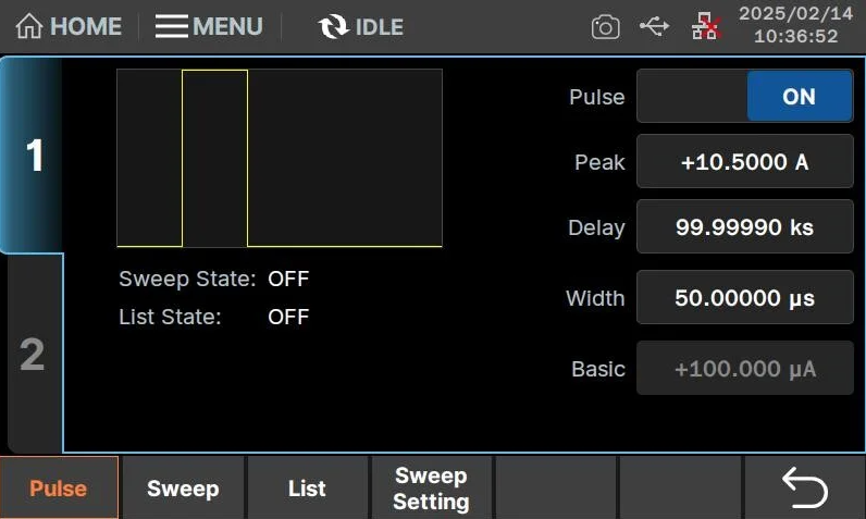 V pulzním režimu dokáže přístroj generovat proud až ±10,5 A s minimální šířkou pulzu 50 µs. To umožňuje přesně simulovat reálné provozní podmínky a přechodové jevy, například při testování výkonových polovodičů jako GaN nebo SiC.