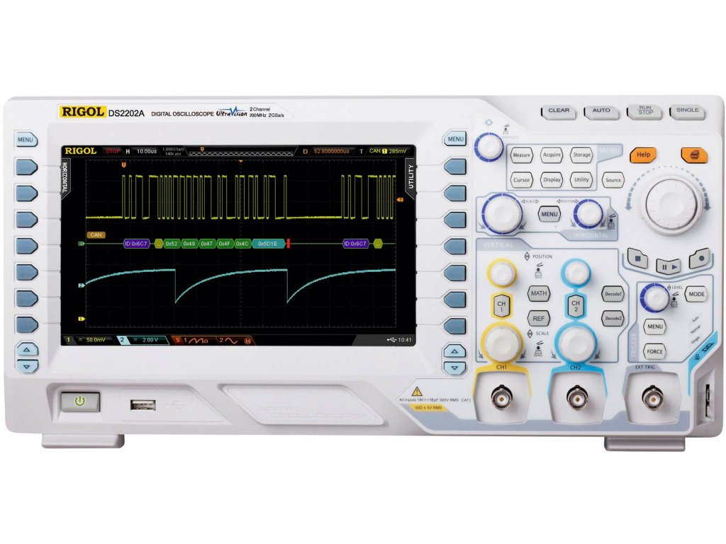 Rigol DS2202A je dvoukanálový osciloskop s šířkou pásma 200 MHz; vzorkování až 2 GSa/s v reálném čase; 0,5 mV ~ 10 V/dílek; 2 ns/dílek ÷ 1000 s/dílek; hloubka paměti 14 M bodů (opt. 56 M bodů); zachycení až 50 000 průběhů/s; uložení a přehrání až 65 000 snímků; trigger sériových sběrnic I2C, SPI, RS-232/UART za příplatek; volitelně dekódování sériových sběrnic (SD-DS2 Decoding Kit) a modul univerzálních spoutěcích funkcí ("Windows", "Nth Edge", HDTV, delay, time out, duration a USB - "AT-DS2 Advanced Trigger"). Rozšířené matematické funkce, maskování pro testy vyhověl/nevyhověl, automatická měření se statistikou. Komunikace USB host, USB, LAN(LXI), AUX, GPIB (opt.). Velký barený LCD WVGA (800 × 480 px) displej s úhlopříčkou 20,32 cm (8 "), víceúrovňové zobrazení intenzity (256 úrovní). Rozměry a hmotnost: 36,2 × 18 × 13,1 cm / 3,9 kg.