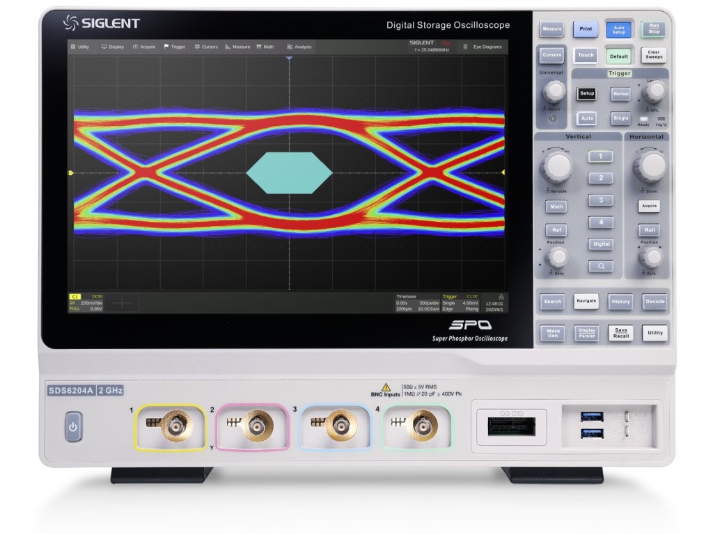 Siglent SDS6054A je 4kanálový digitální osciloskop s šířkou pásma 500 MHz, vzorkováním až 5 GSa/s, hloubkou paměti 500 Mp/ch a 12,1" kapacitním dotykovým displejem.