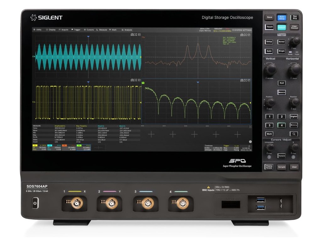 Osciloskop Siglent SDS7604AP je 4kanálový digitální osciloskop s šířkou pásma až do 6 GHz.