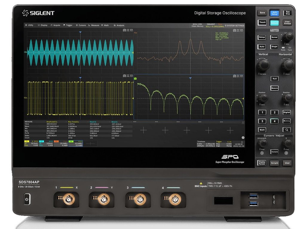 Osciloskop Siglent SDS7804AP je 4kanálový digitální osciloskop s šířkou pásma až do 8 GHz.