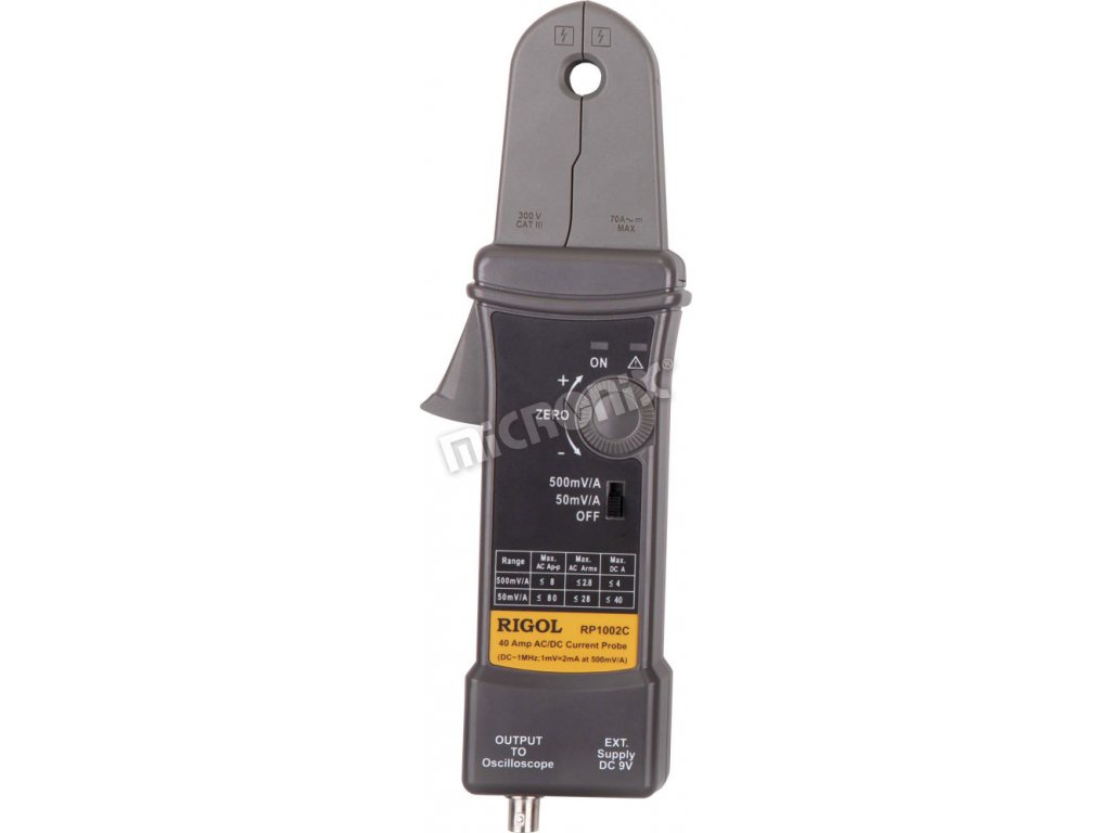 Proudová sonda k osciloskopu; šířka pásma DC ~ 1 MHz; max. DC proud ±70 A; AC peak-peak max. 140 A; RMS: 50 A; kompatibilní se všemi osciloskopy Rigol.