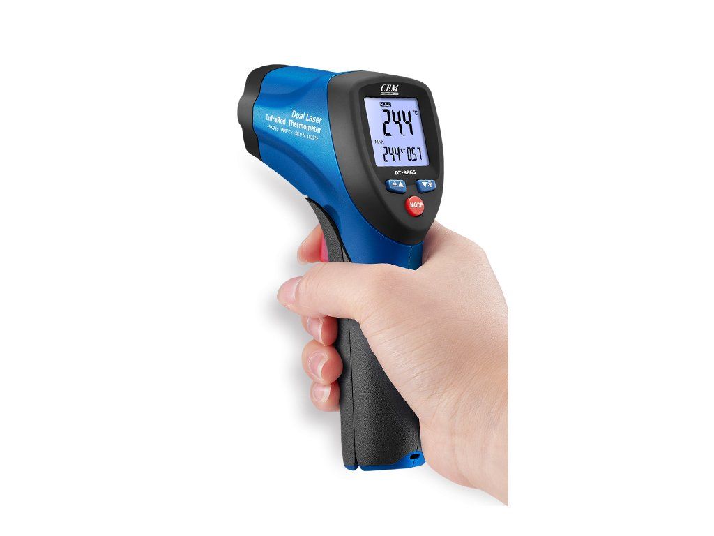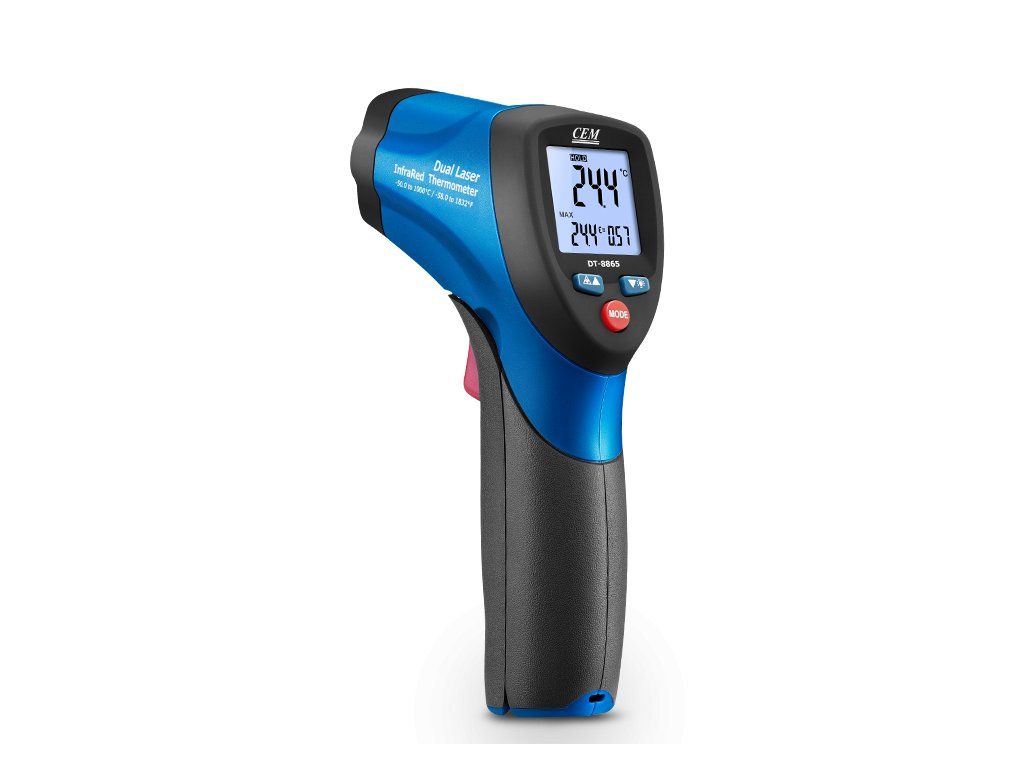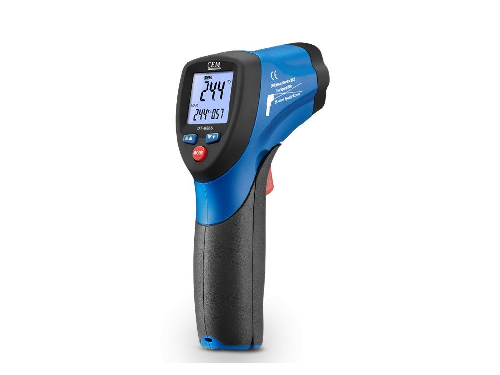 CEM DT-8865 dokáže provádět bezkontaktní (infračervené) měření teploty stisknutím jediného tlačítka. Vestavěný dvojitý laserový ukazatel přesně indikuje oblast měření teploty. Podsvícený LCD displej a pohodlné umístění tlačítek zajišťují ergonomické ovládání.