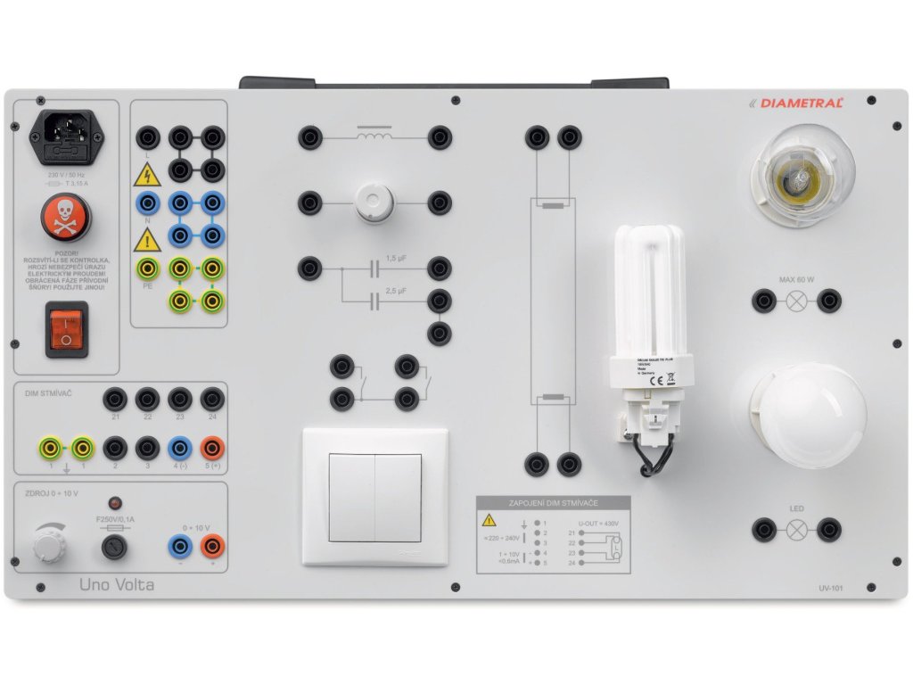 Výukový systém UnoVolta UV-101 slouží k procvičování a experimentům při zapojování základních typů světelných zdrojů a svítidel se žárovkami a zářivkami. Kombinací použitých prvků lze porovnávat jejich vliv na funkci jednotlivých světelných zdrojů. Panel lze kombinovat s výukovými panely UV-100 a UV-102. Napájení panelu je realizováno napětím 230V/50Hz z elektrické sítě.