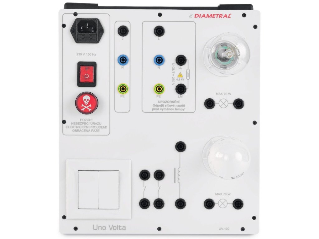 Výukový systém UnoVolta UV-102 je rozšiřující panel UV-101 a slouží k procvičování a experimentům při zapojování světelných zdrojů s žárovkami, halogenovými žárovkami a výbojkami. Napájení tohoto panelu je realizováno napětím 230V/50Hz z elektrické sítě.