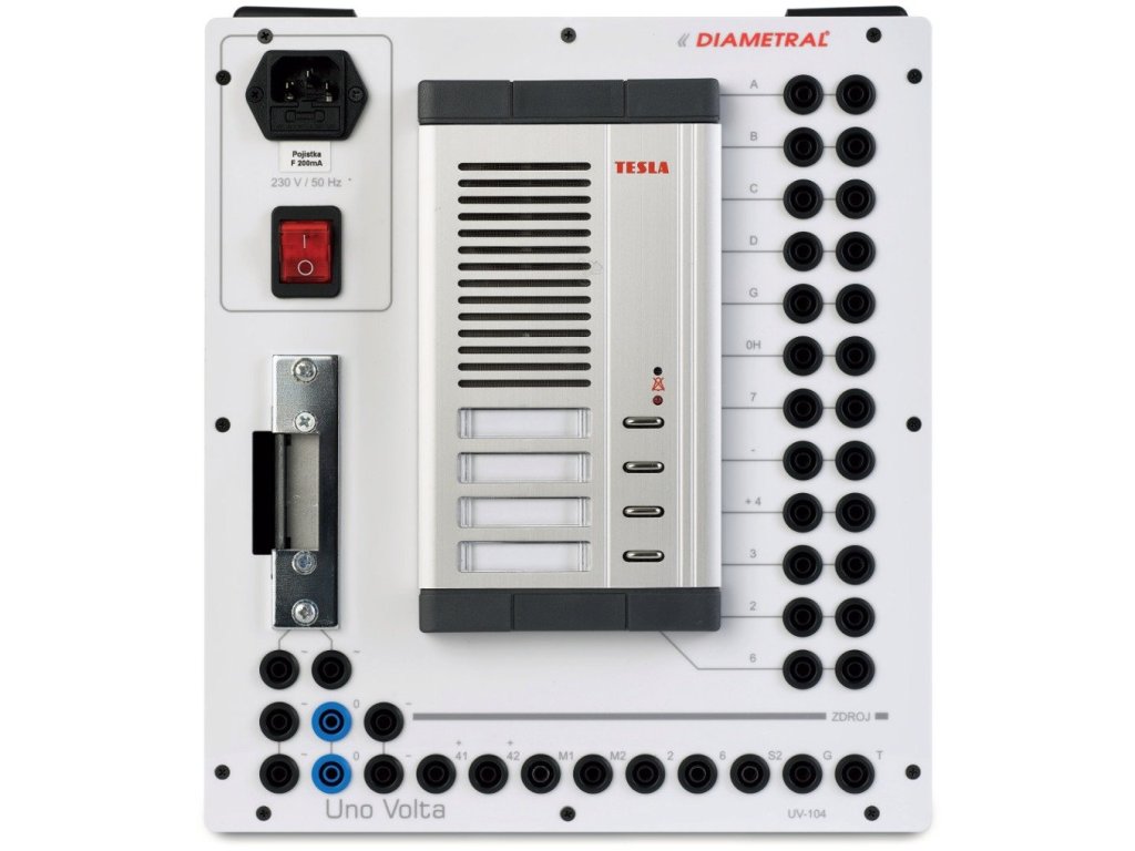 Výukový systém Uno Volta UV-104 je určen k seznámení studentů s problematikou klasického domácího vrátného. Panel obsahuje vnější tablo s reproduktorem a mikrofonem a dále elektrický domovní zámek.