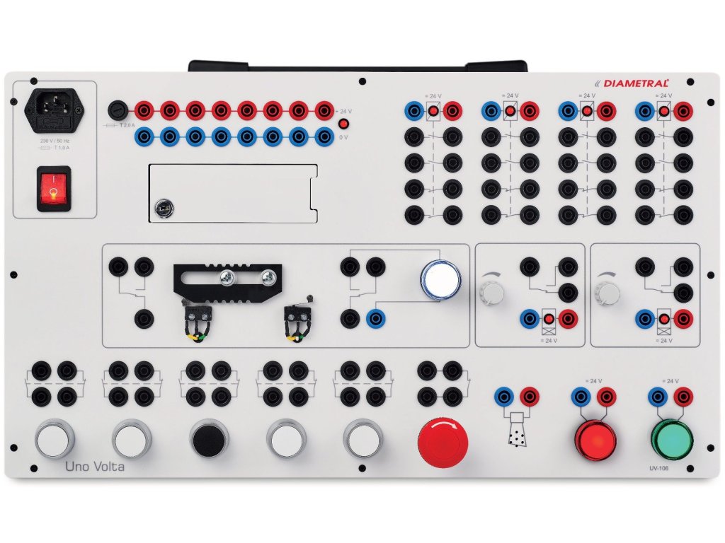 Výukový systém Uno Volta UV-106 slouží k procvičování a experimentům při zapojování elektrických ovládacích obvodů se stykači. Studenti se tak mají možnost seznámit se základními principy funkce stykačů a jejich účelu v elektrických obvodech. Panel nabízí nesčetné možnosti zapojení a simulací, například ovládání elektromotoru, změna směru otáčení motoru, signalizace dojezdu do koncové polohy včetně akustické signalizace, spouštění strojů se zpožděním a podobně. Panel je vybaven simulátorem poruch, které učitel může aktivovat pomocí přepínačů pod zamykatelnými dvířky. Napájení panelu je realizováno napětím 230V/50Hz z elektrické sítě. Zabudovaný zdroj poskytuje napětí 24V DC pro napájení cívek stykačů a dalších zařízení.