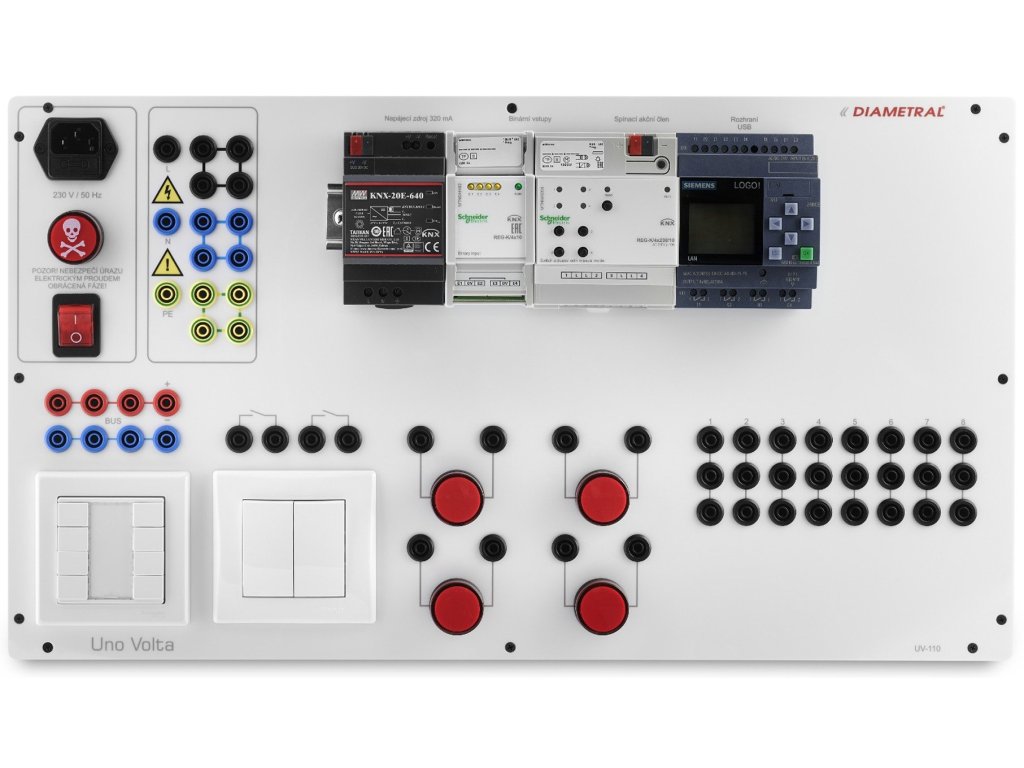 Výukový systém Uno Volta UV-110 slouží k procvičování a experimentům při zapojování základních silnoproudých domovních rozvodů inteligentního domu s využitím přístrojů, využívající jednotnou datovou sběrnici. Panel umožňuje seznámí s problematikou moderních systémů ovládání domovních rozvodů, postavených na bázi EIB/KNX. Ve spojení s s moduly UV-100 a UV-109, také umožňuje porovnání výhod a nevýhod systému ve srovnání s klasickými silnoproudými rozvody a se systémem Inels. Napájení panelu je realizováno napětím 230V/50Hz z elektrické sítě.