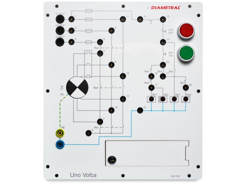 Výukový panel Uno Volta UV-113 slouží k seznámení s problematikou zapojení třífázového elektromotoru. Obsahuje úplné zapojení třífázového elektromotoru s rozběhem s automatickým přepnutím D/Z pomocí časového relé. Ovládání obvodu je řešeno stykači a tlačítky a slouží k demonstraci funkce standardního zapojení elektromotoru, pro důkladné pochopení celé problematiky je panel vybaven „simulátorem poruch“ tvořený přepínači pod uzamykatelným krytem. Studenti při zjišťování poruch využijí měřící body, umístěné na panelu. Seznámí se tak s postupy řešení při odhalování závad, které mohou v praxi nastat.