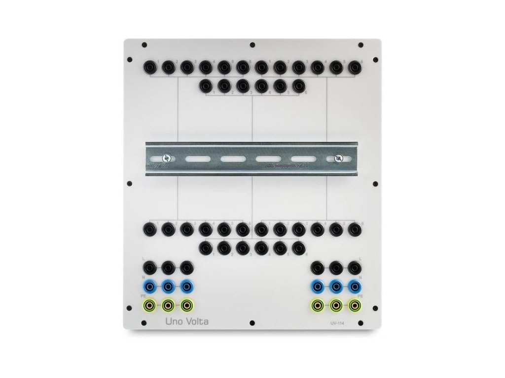 Výukový panel Uno Volta UV-114 umožňuje přidávat další komponenty určené pro montáž na DIN lišty a připojovat je na zdířky Φ4mm. Panel je vhodný jako rozšíření pro panel elektroinstalace s využitím EIB/KNX, nebo INELS. Lze jej také využít pro PLC komponenty, jističe, proudové chrániče a pod.