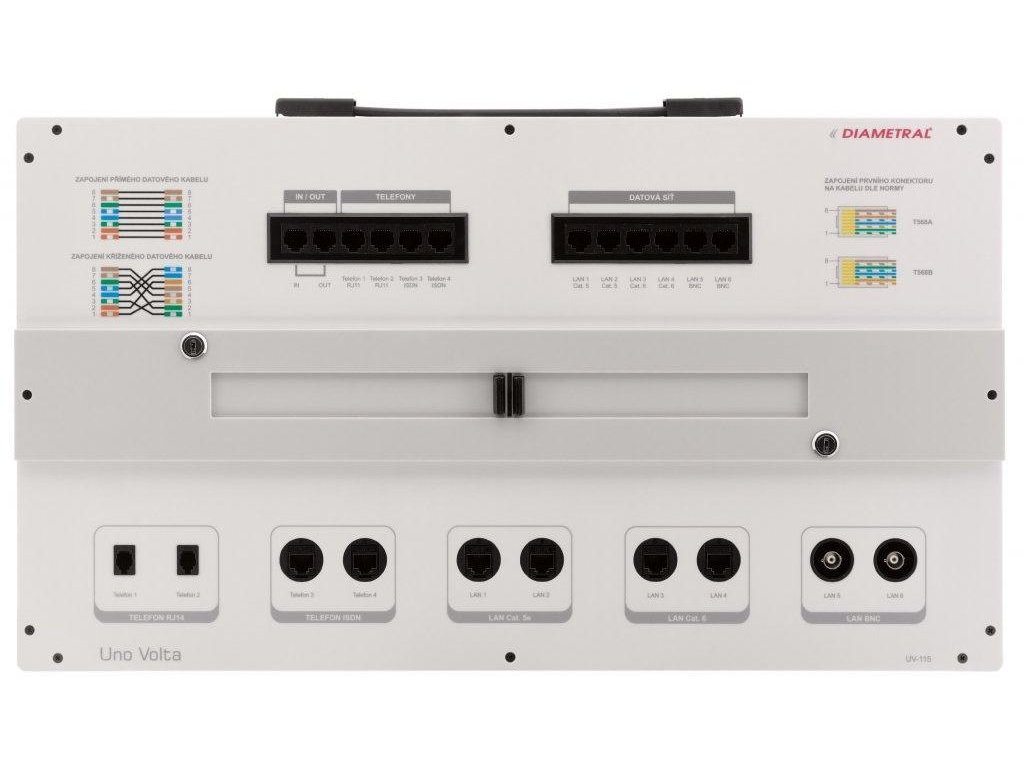 Výukový panel Uno Volta UV-115 slouží k seznámení se s problematikou a nácviku zapojování různých typů datových a telefonních sítí. Panel obsahuje zásuvky Cat5, Cat6, ISDN a společný patch panel, kam jsou jednotlivé zásuvky vyvedeny. Tento panel je vybaven také simulátorem poruch, které učitel může aktivovat pomocí propojek, umístěných pod posuvnými dvířky.