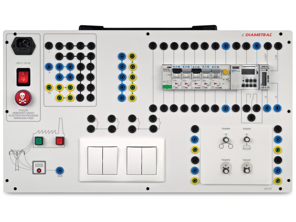 Výukový panel Uno Volta UV-117 slouží k procvičování a experimentům při zapojování domovních jednofázových elektrických instalací v sítích TN-S a TN-C se zásuvkami a svítidly s využitím spínačů, časových spínačů i elektroměru a HDO. Napájení tohoto panelu je realizováno napětím 230V/50Hz z elektrické sítě.
