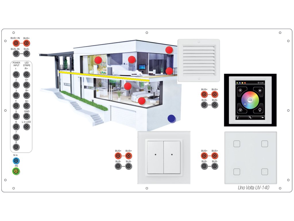 Výukový systém UNO Volta UV-140 představuje panel INELS „chytrá domácnost“, demonstrační panel „DŮM“. Řada výukových panelů UNO Volta na bázi systému INELS slouží k demonstraci základních funkcí „chytré domácnosti“, jinými slovy pokrokového řízení elektrických rozvodů v domácnosti na bázi řídicího systému, který zvyšuje uživatelský komfort bydlení prakticky ve všech oblastech. Jedná se o programové řízení osvětlení jednotlivých místností, vytápění domu, ale i ovládání okenních žaluzií, nebo komfortní přehled o dění v domě, či kolem domu pomocí kamerových systémů.