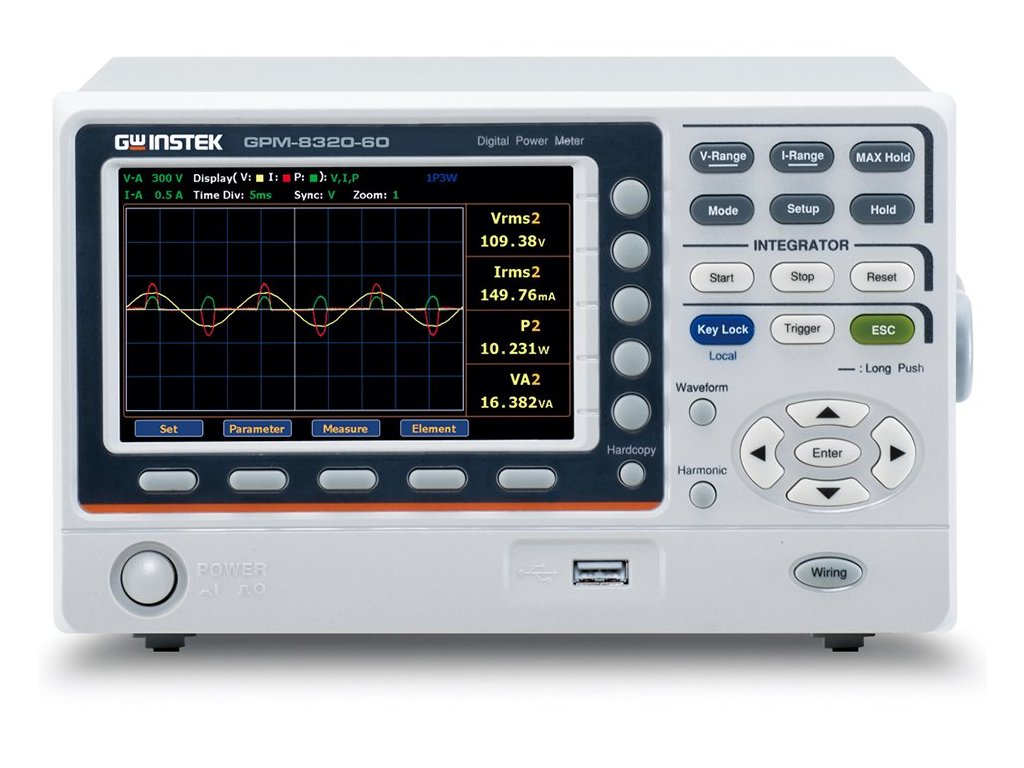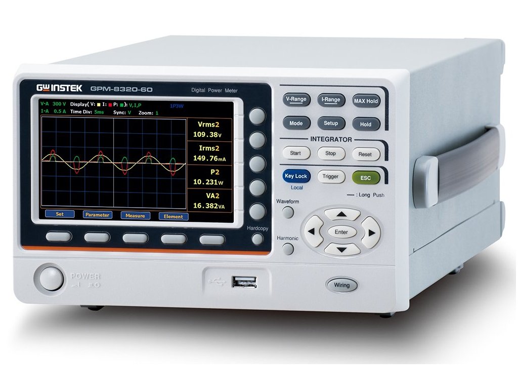 GW Instek GPM-8320-60 je 2-kanálový True RMS digitální měřič výkonu, který je vybavený 16bitovými A/D převodníky a vzorkovací frekvencí 300 kHz s možností výběrů z různých režimů měření (AC+DC/ AC/ DC/ V-MEAN). Poskytuje až 25 souvisejících parametrů pro měření výkonu. Přímý proudový vstup až do 60 A.