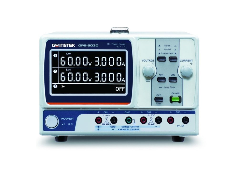 GW Instek GPE-6030 je lineární stejnosměrný zdroj s vysokým rozlišením. Je náhradou stávajícího modelu GPC-6030D. Model GPE-6030 poskytuje výstupní výkon 385 W a je vybaven třemi nezávislými izolovanými výstupními kanály.